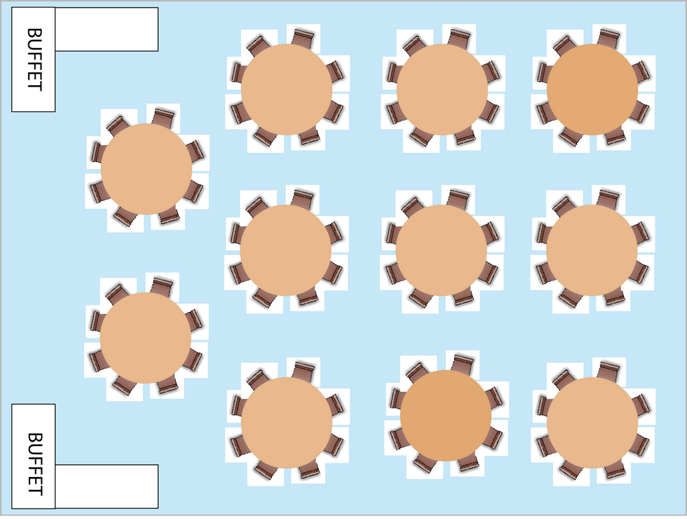 Indretning med runde borde med plads til 88 personer