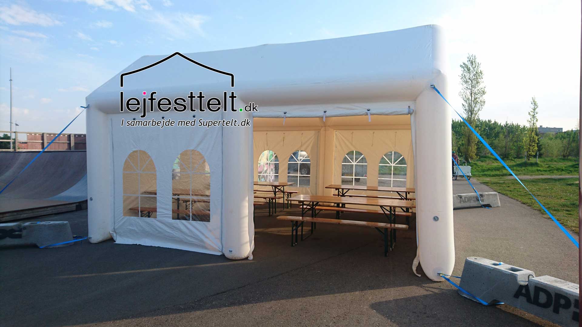 Oppustelige festtelte udlejes kun med opsætning/nedtagning (inkluderet i prisen).